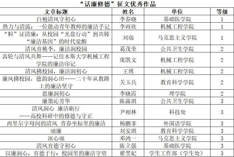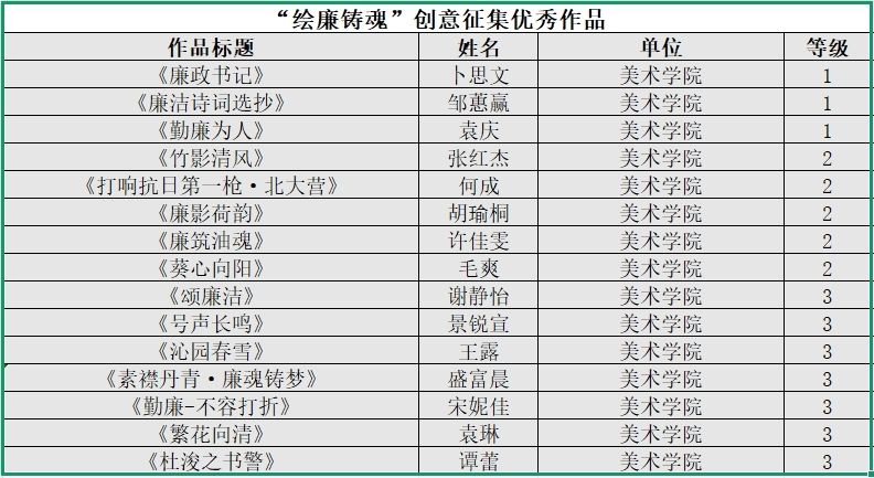 经严格评审,《白袍清风守初心》《热力与清流:一位能动青年教师的廉洁手记》等15篇征文及《廉政书记》《勤廉诗词选抄》等15件设计作品分获一、二、三等奖(完整名单附后)。