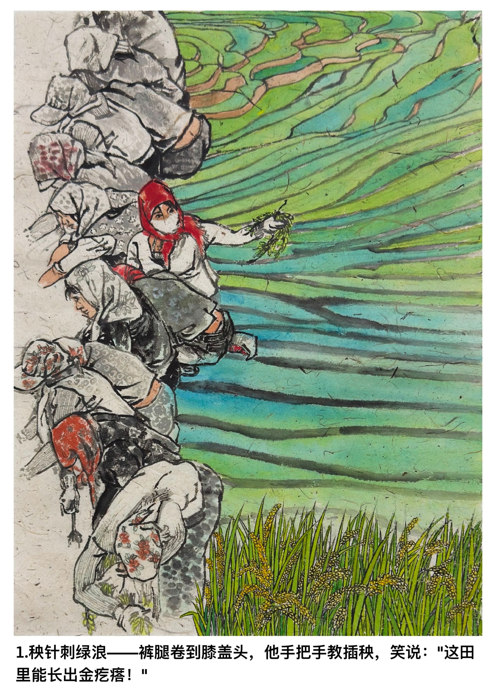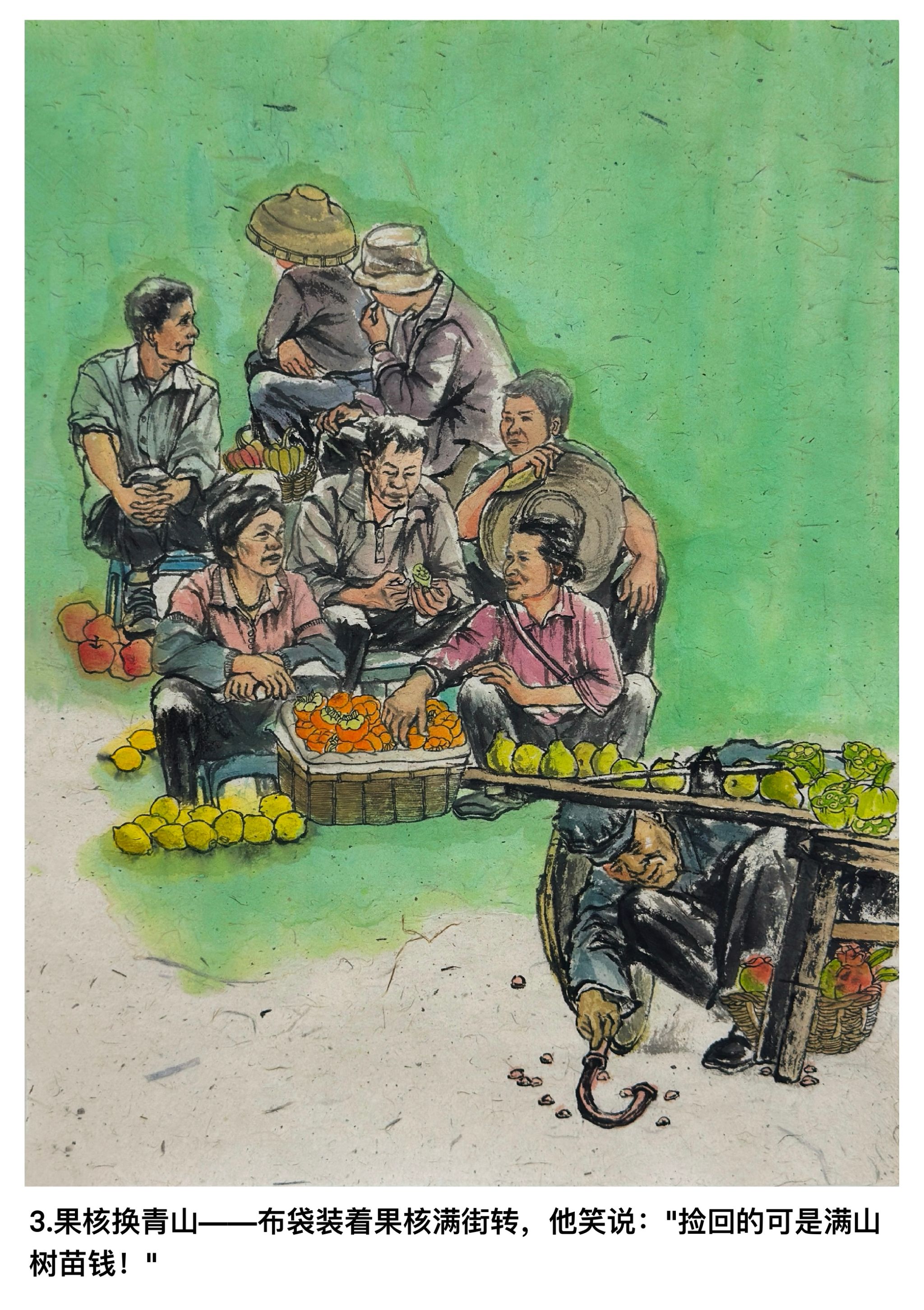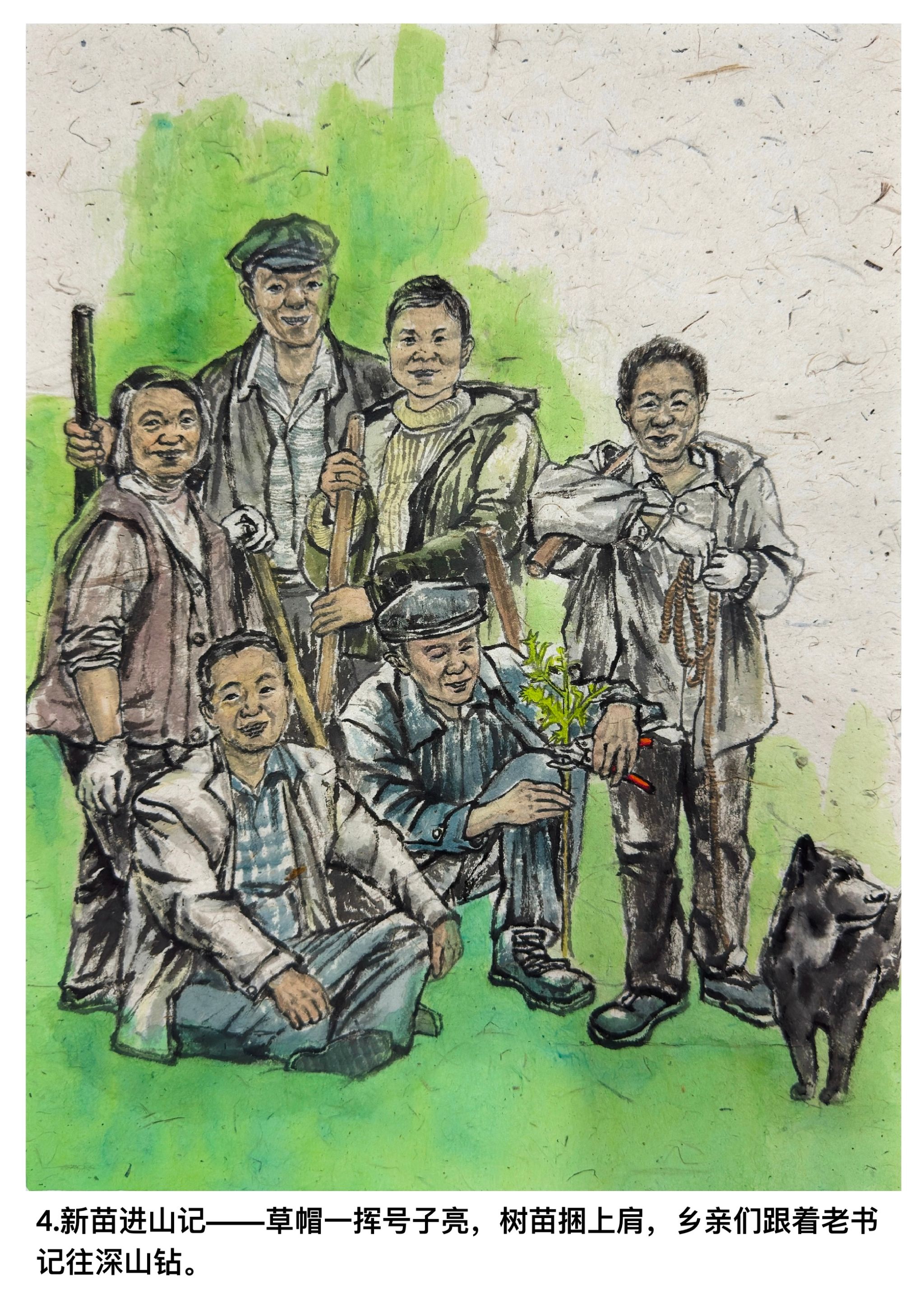 这组艺术作品精心撷取四个典型场景,立体呈现杨善洲书记的崇高风范。首幅以改造梯田插秧为画面主体,刻画其带领村民向贫瘠土地开战的坚毅;次幅聚焦挑水上山浇灌茶树,定格其呵护产业的躬身身影;第三幅捕捉市场捡果核育苗的瞬间,凸显勤俭办事业的智慧;末幅展现率村民进山植树的宏大场景,彰显绿化荒山的担当。四幅作品以时间线串联,从土地改造到产业培育,再到生态建设,层层递进展现其不畏艰辛、勤廉奉公的精神,具有深刻的教育内涵与艺术感染力。