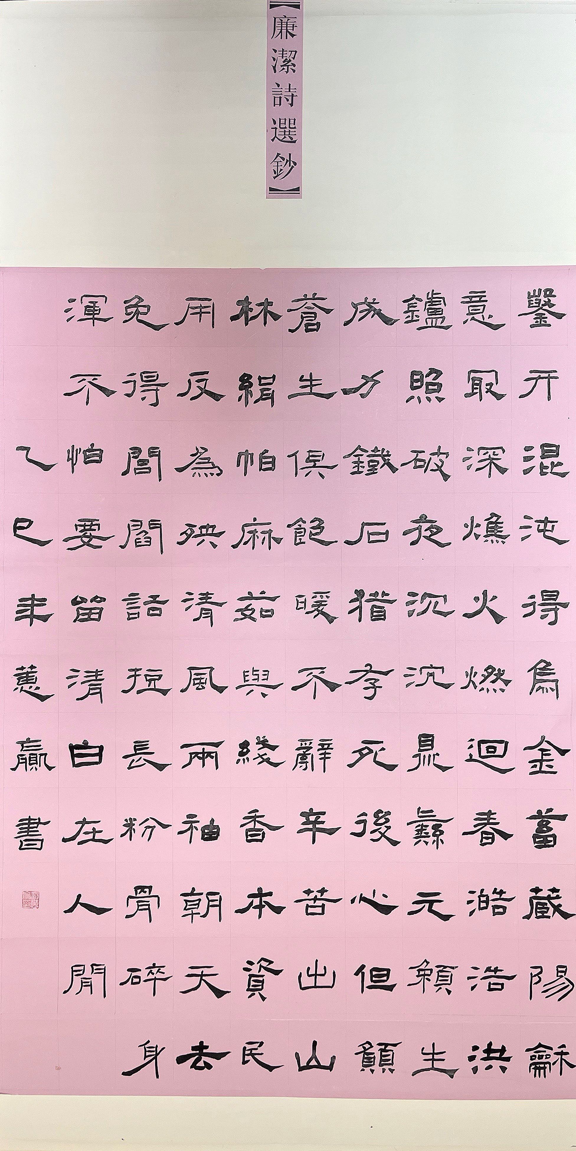 此作以“廉洁”为核心,用笔上,恪守《礼器碑》“瘦劲挺拔、刚健端严”特质,横画起笔方峻、收笔顿挫,竖画如柱顶天,波磔含蓄劲健,无刻意肥腴之笔,暗合“清廉不阿”之韵。结体取碑中“疏朗匀称”之态,字距宽于行距,疏密相生间,显“心无杂念、磊落坦荡”之意。整体上墨色浓淡相宜,枯润相生,既存《礼器碑》的庙堂正气,又借诗词意蕴传递“洁身自好、守正奉公”的精神,使书艺与内涵相得益彰。